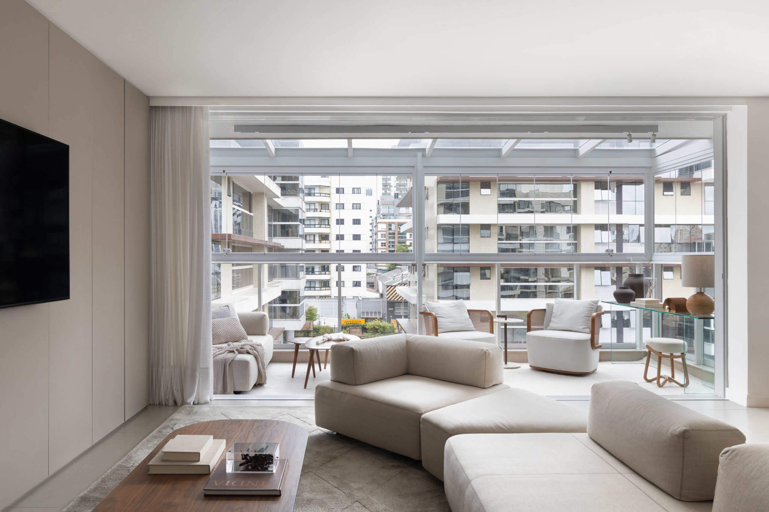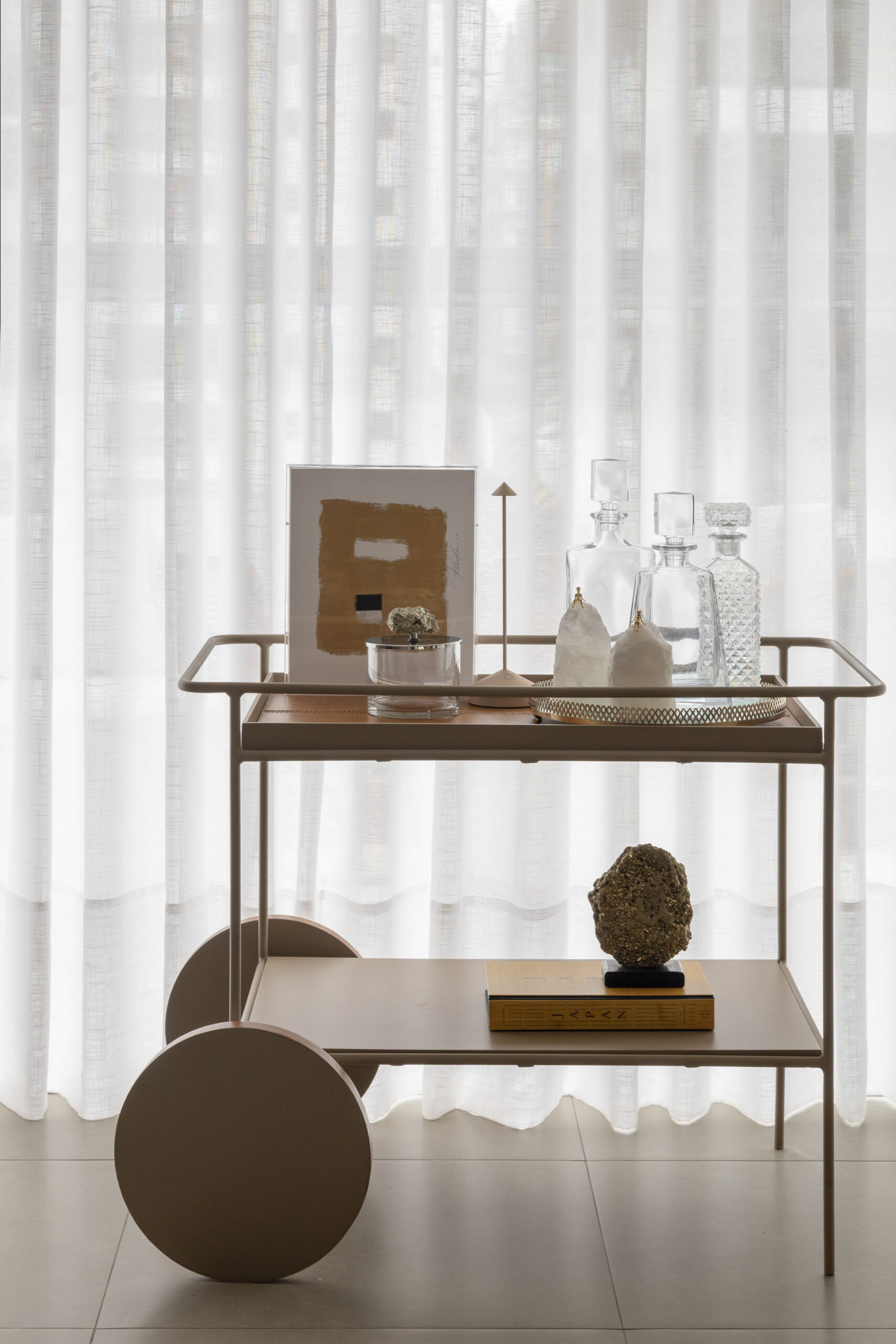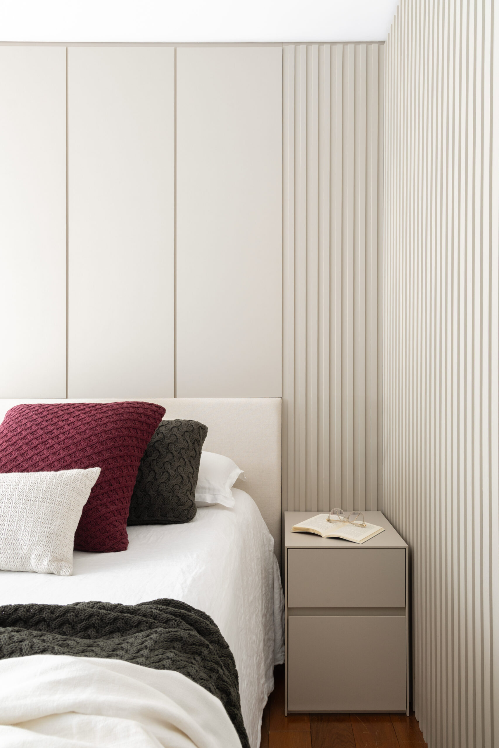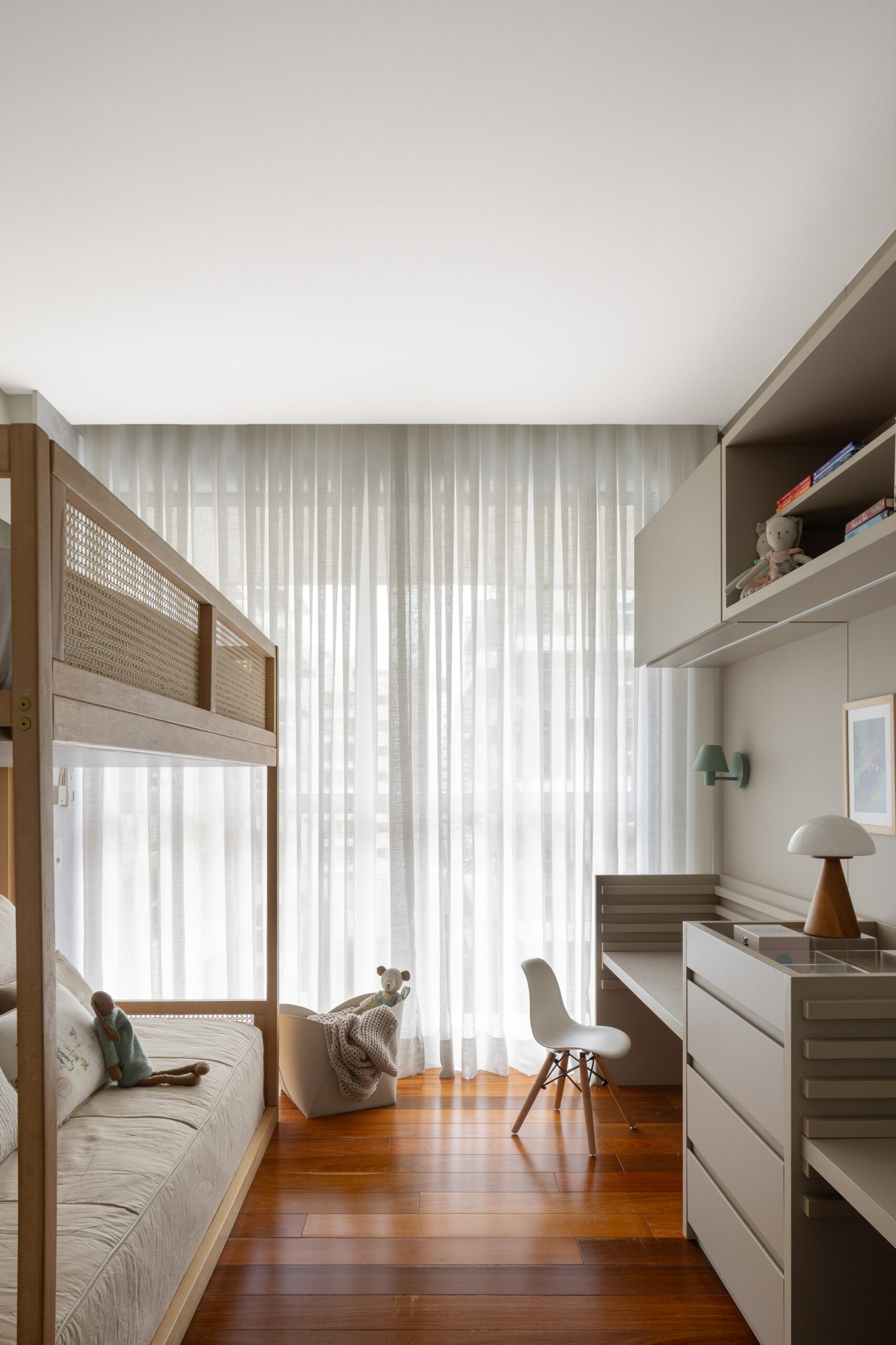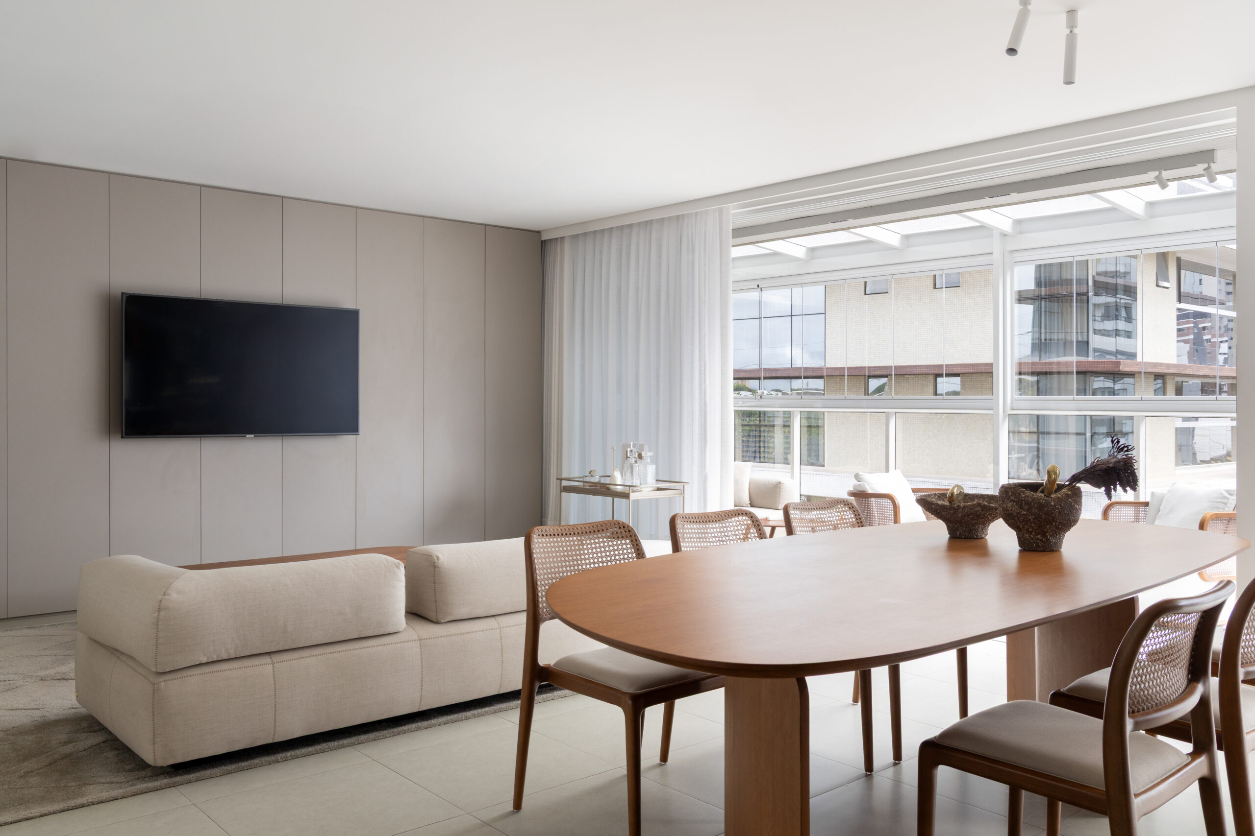 Com uma planta bem estruturada, a proposta de renovação dos interiores deste apartamento exigiu poucas modificações. Na seleção dos acabamentos, destacam-se escolhas refinadas, com predominância de materiais naturais e peças de design autoral. Elementos como madeira e tecidos com texturas orgânicas, como linho e couro foram utilizados para compor uma atmosfera convidativa. A marcenaria com painéis mimetizados e o mármore Nuvolato agregam sofisticação e aquecem visualmente a área social. O piso em madeira sucupira é o protagonista da área íntima, trazendo personalidade e conforto. Nos quartos, a marcenaria foi cuidadosamente planejada para otimizar o uso dos espaços, garantindo funcionalidade sem abrir mão da estética. O uso pontual de cores contribui para ambientes acolhedores.