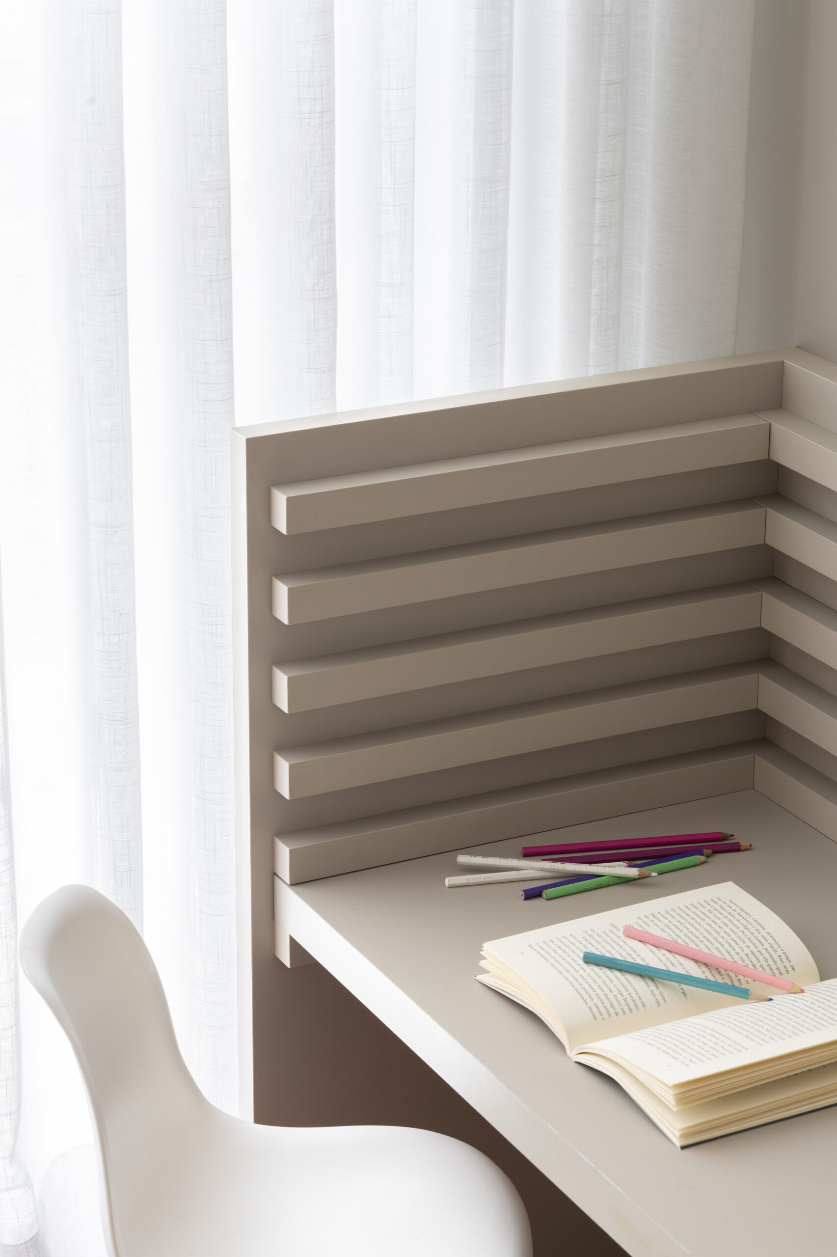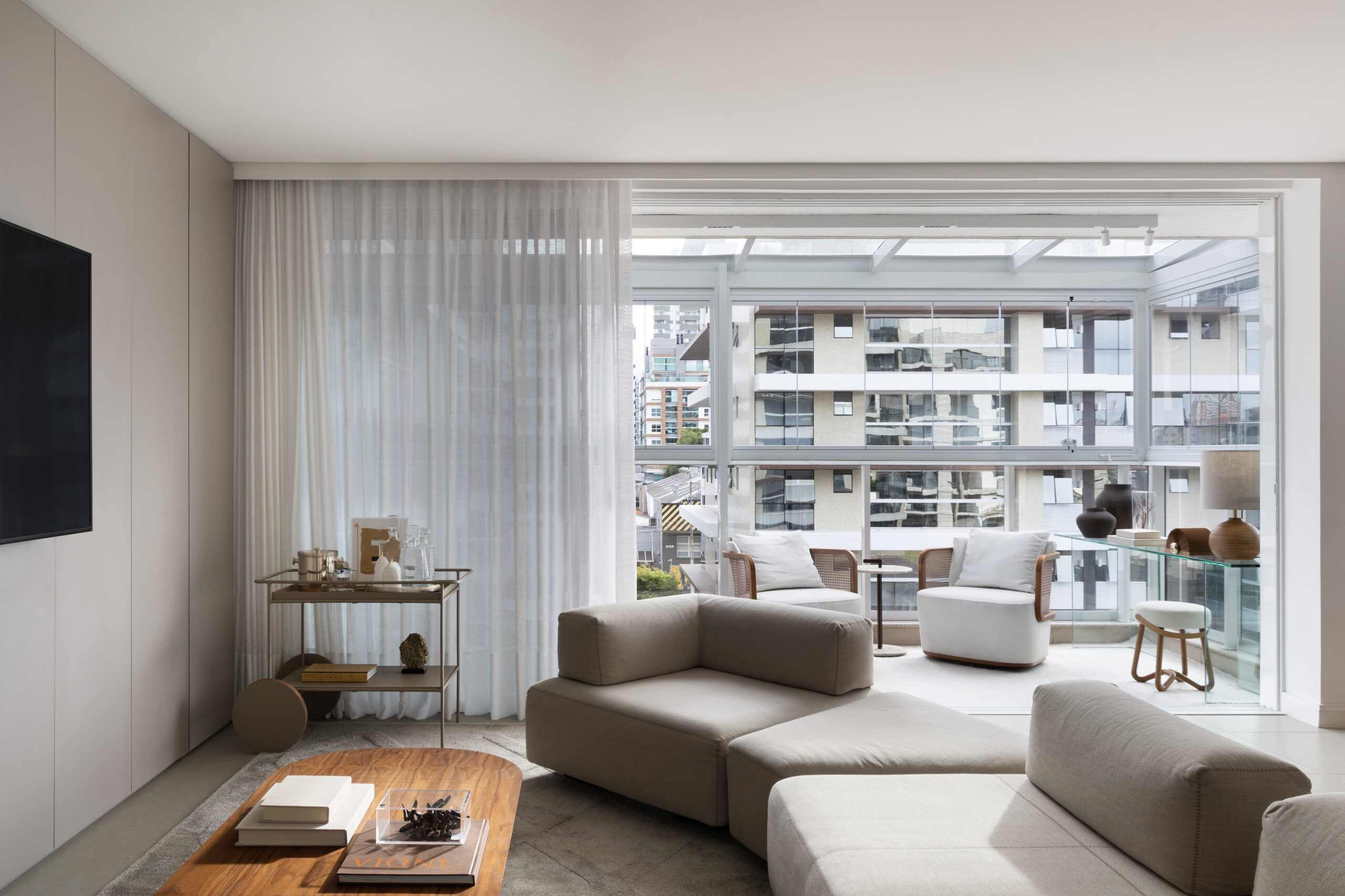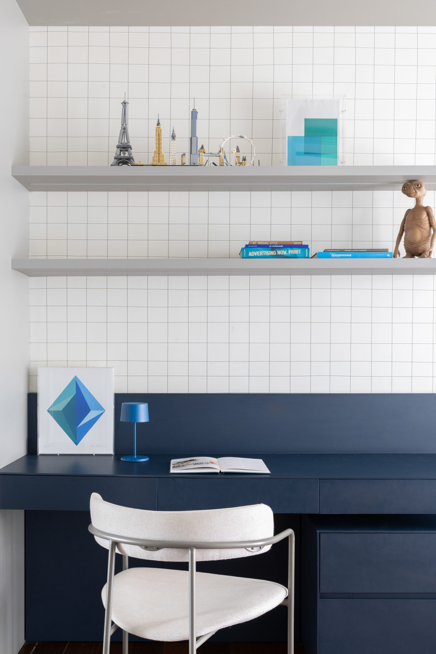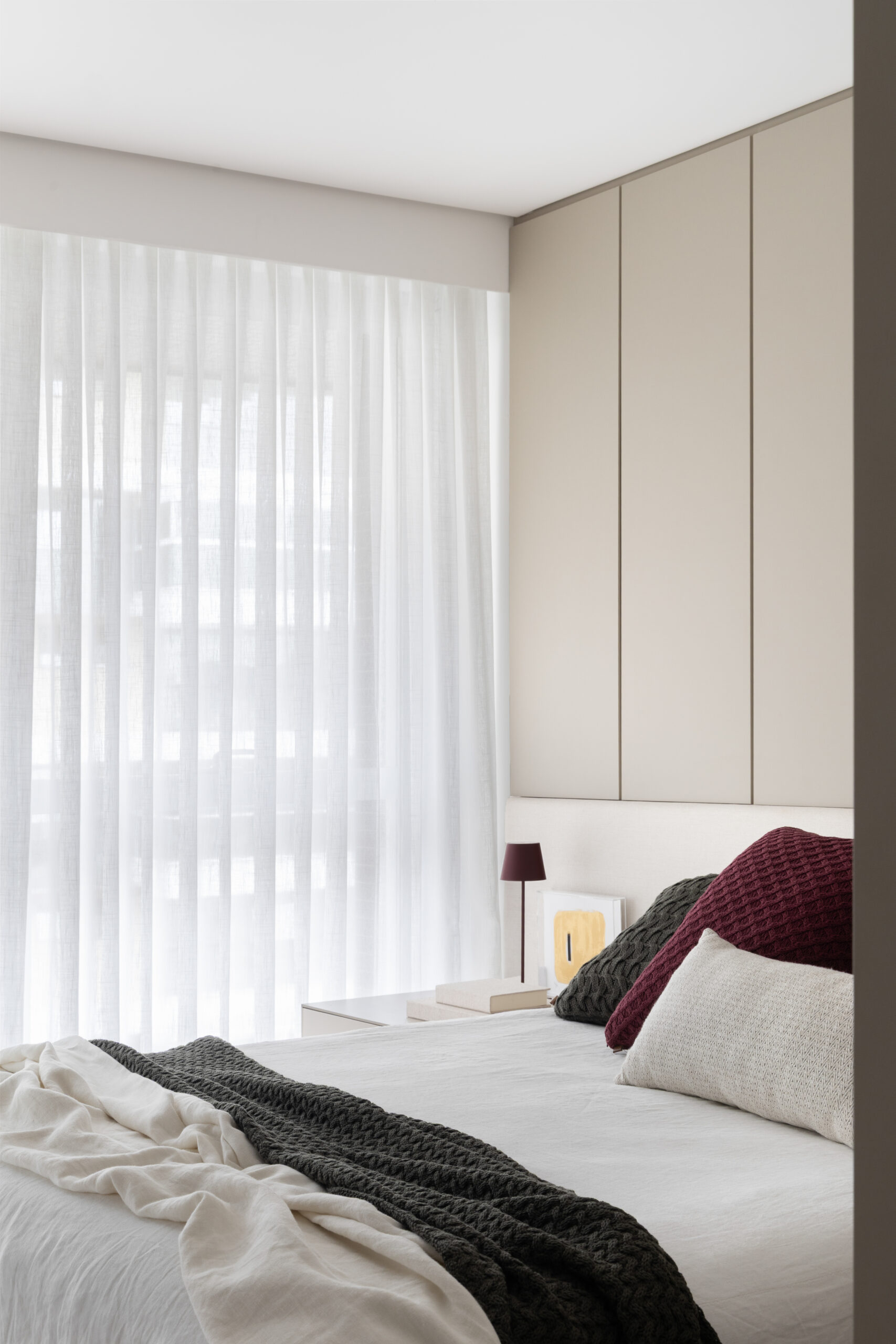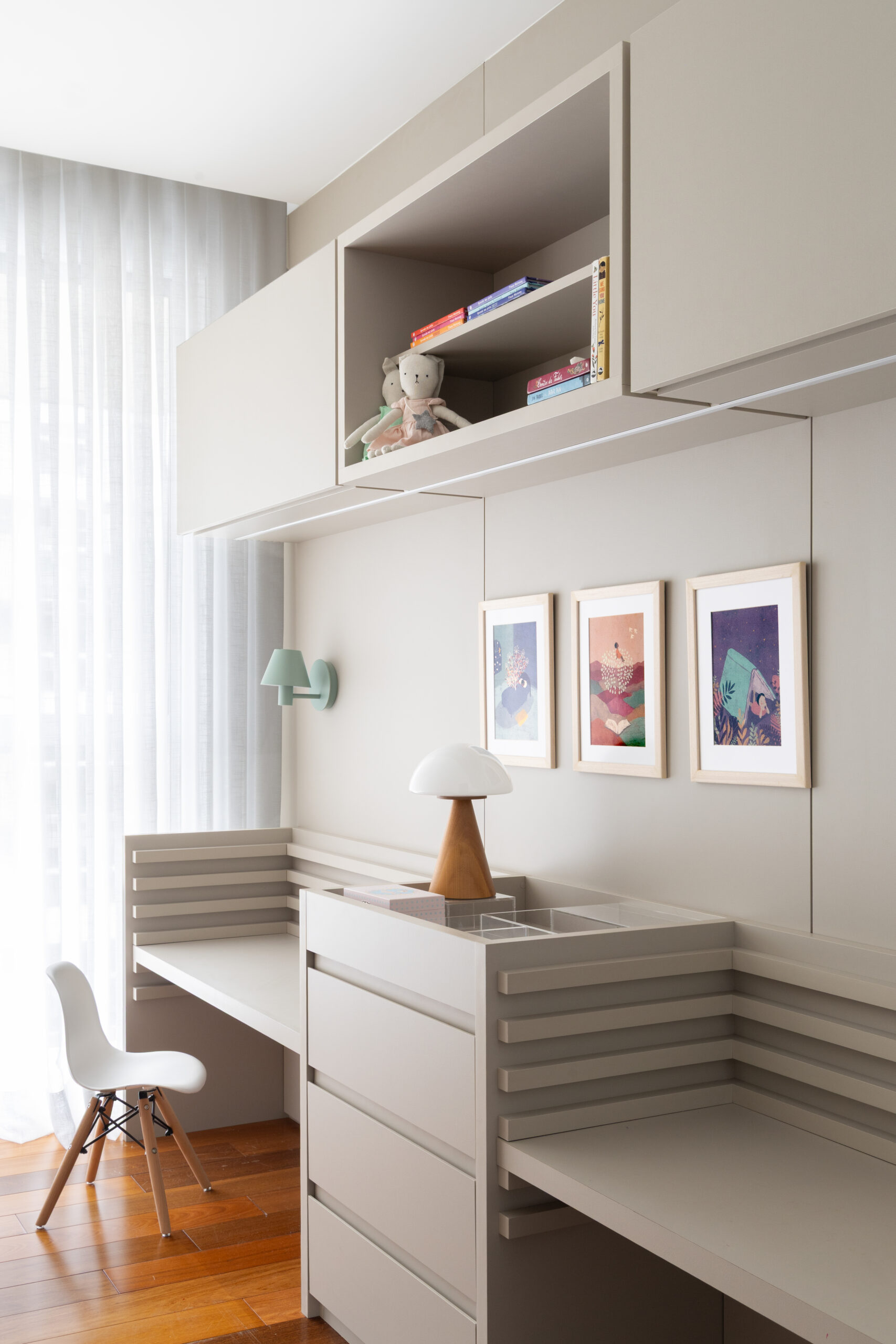 Com uma planta bem estruturada, a proposta de renovação dos interiores deste apartamento exigiu poucas modificações. Na seleção dos acabamentos, destacam-se escolhas refinadas, com predominância de materiais naturais e peças de design autoral. Elementos como madeira e tecidos com texturas orgânicas, como linho e couro foram utilizados para compor uma atmosfera convidativa. A marcenaria com painéis mimetizados e o mármore Nuvolato agregam sofisticação e aquecem visualmente a área social. O piso em madeira sucupira é o protagonista da área íntima, trazendo personalidade e conforto. Nos quartos, a marcenaria foi cuidadosamente planejada para otimizar o uso dos espaços, garantindo funcionalidade sem abrir mão da estética. O uso pontual de cores contribui para ambientes acolhedores.